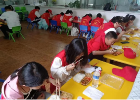 拓展活动结束,工作人员带领孩子们来到幼儿园,体验儿时的快乐时光,并在此共进午餐。